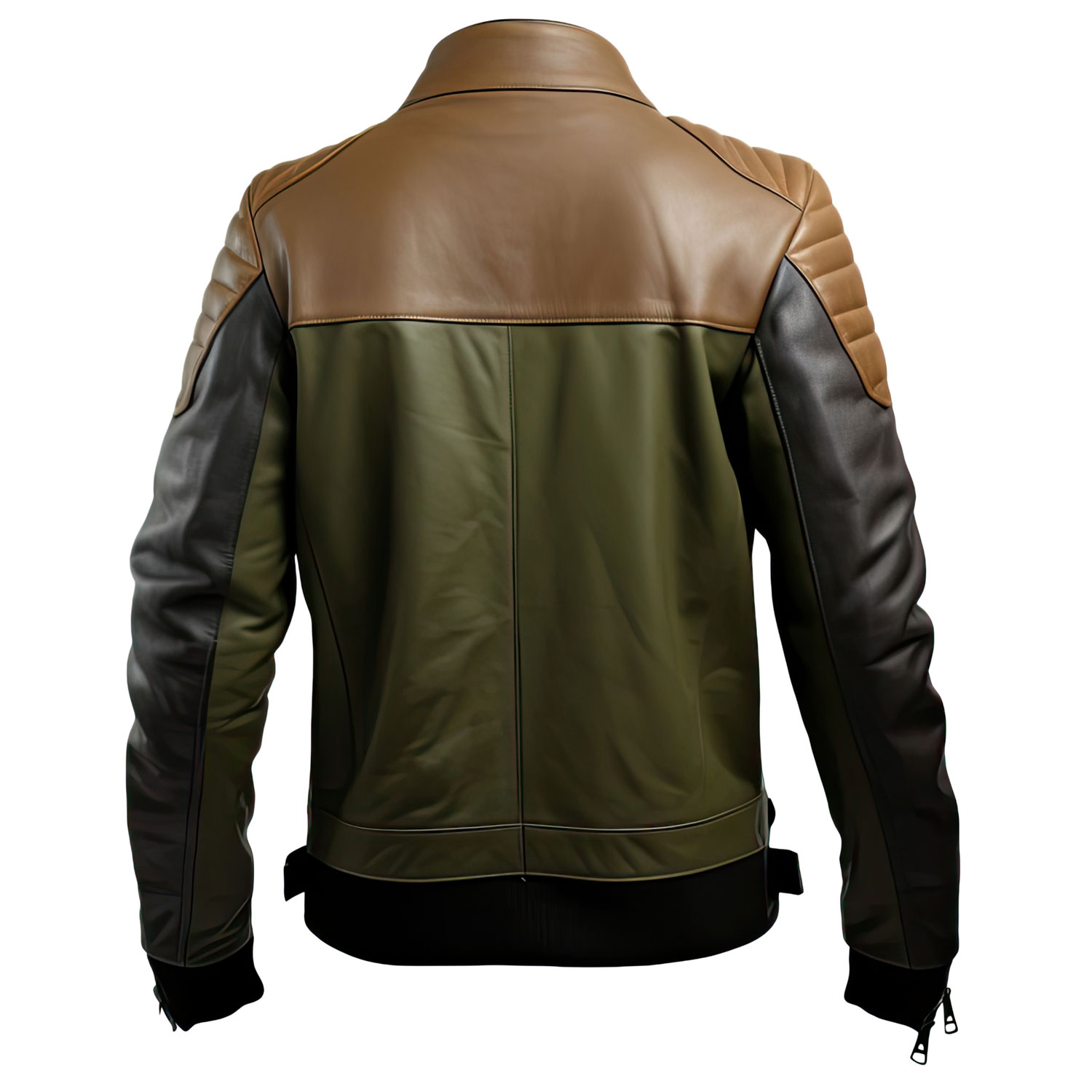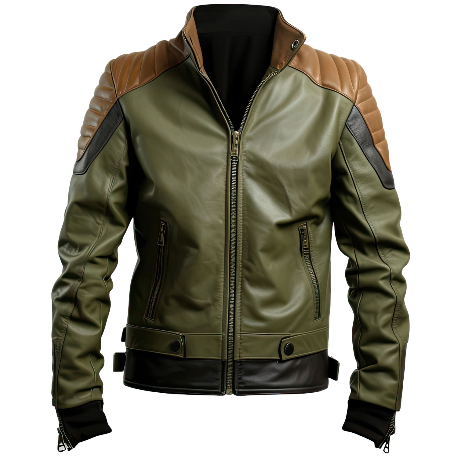 Leather motorcycle jacket men introduces a fresh, modern twist with its distinctive two-tone color scheme. The rich olive-green body is complemented by black and brown accents on the shoulders and collar, creating a visually striking look that’s both bold and sophisticated. Whether you’re heading out for a casual day or a night on the town, this jacket is sure to make a statement.