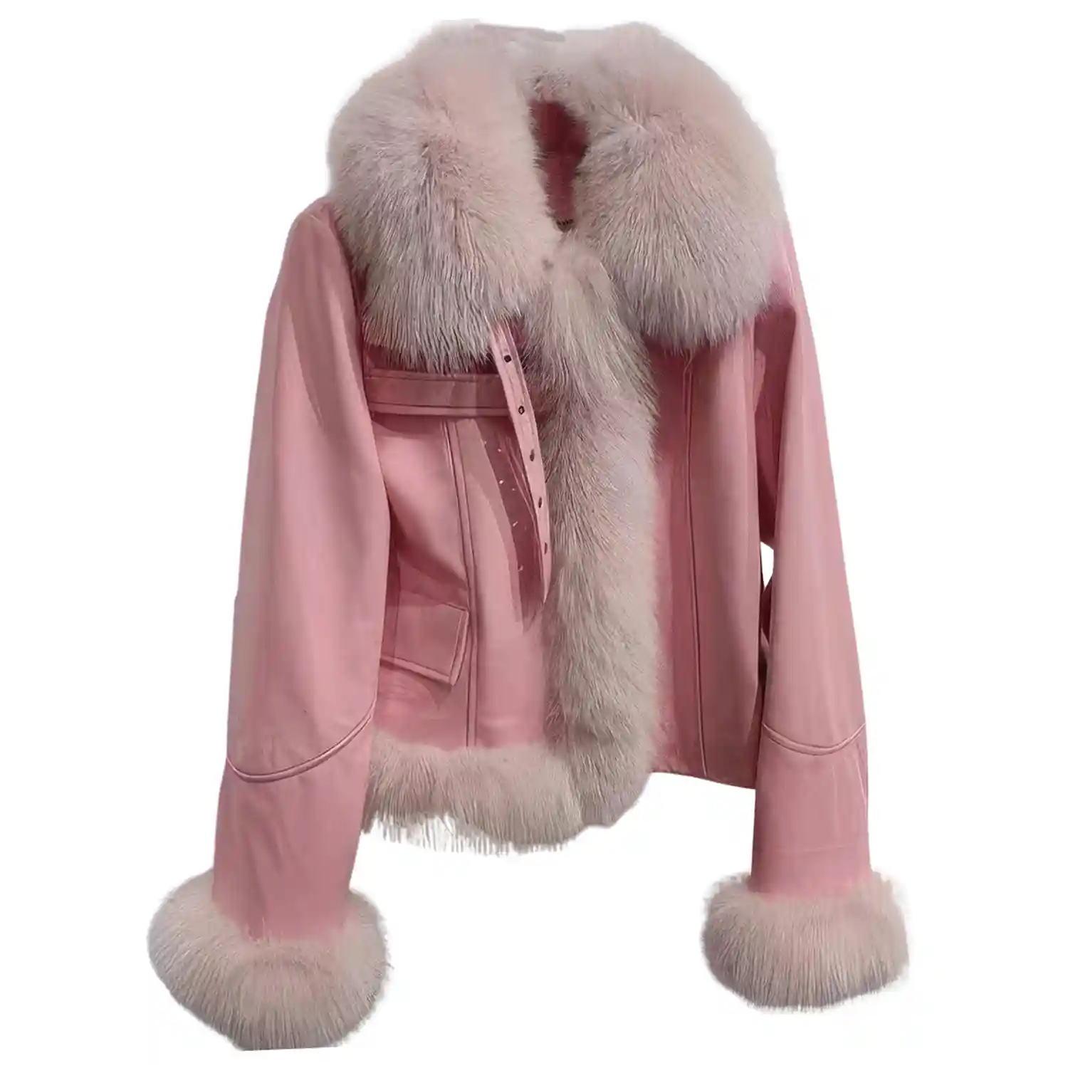 HAVOCK PINK LEATHER JACKET WOMEN GENUINE SHEEPSKIN SHERPA SHEARLING FAUX FUR COLLAR PINK LEATHER JACKET FOR WOMEN
